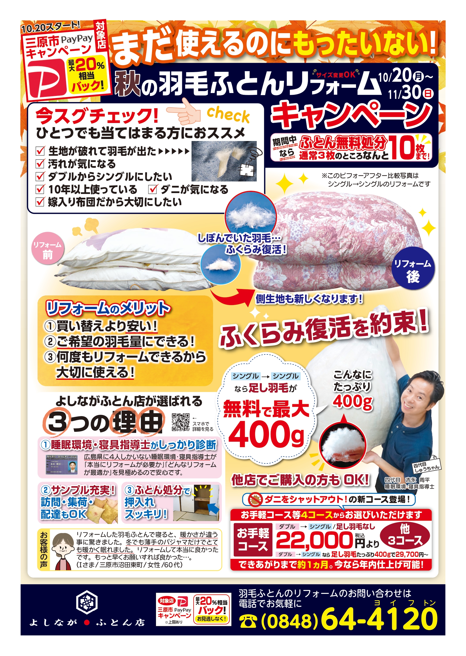 元気なおはようを創る!よしながふとん店です!いよいよ明日から三原市のPayPayキャンペーン開始!