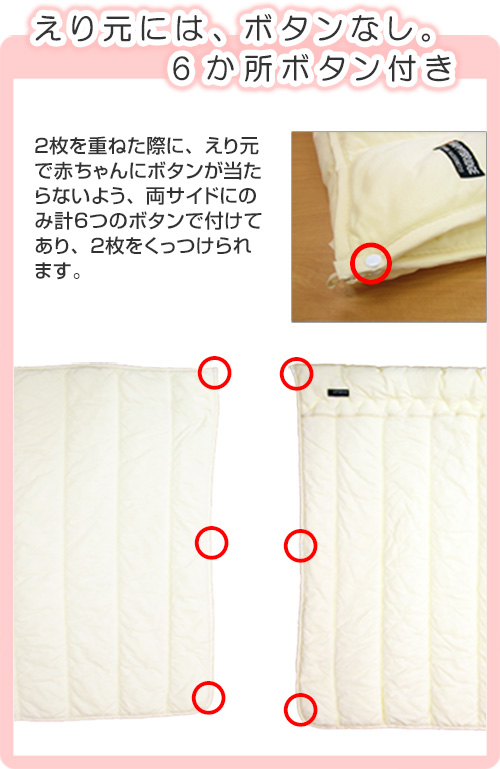 通常ベビー掛ふとんとベビー肌掛ふとんは、サイズが異なり、それぞれカバーを用意しなければいけませんが、ふわふわ綿のベビー掛ふとんは、合掛、肌掛ともに同じサイズなので、肌掛ふとんのカバーは必要ありません。